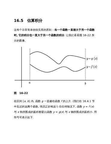 16.5 估算积分 这有个非常简单但很实用的原则:当一个函数一直都大于另一个函数 时, 它的积分也一直大于另一个函数的积分. 让我们看看图 16-22 所 示的图像. 图 16-22 在区间 [a, b] 内, 函数 g 一直都在函数 f 的上方. (我们在 16.4.1 节 中见过的这两个函数, 情况正好相反!) 在任何情况下, 函数 y = f (x) 与 x 轴所围成的面积都要比函数 y = g(x) 与 x 轴所围成的面积小. 用 符号可表示如下.