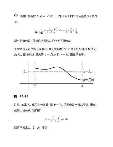 2 例如, 求函数 f (x) = x 在 [0, 2] 区间上的平均值是多少?很简 单, 平均值 . 所有要做的是, 用积分结果除以积分上下限的差. 来看看这个定义的几何解释. 我们把函数 f 在区间 [a, b] 的平均值记 为 f , 图 16-28 是关于 y = f (x) 和 y = f 图像的例子. av av 图 16-28 注意, 如果 f 仅仅为一常数, 则 y = f 的图像是一条水平线. 现在, av av 使用上述公式, 我们有 两边同时乘以 (b - a), 可得