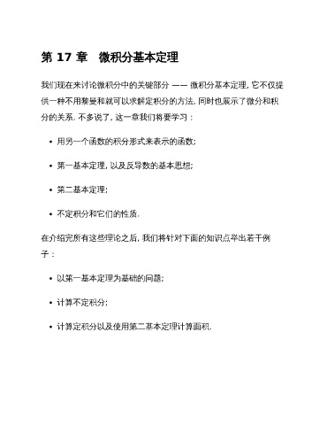第 17 章 微积分基本定理 我们现在来讨论微积分中的关键部分 —— 微积分基本定理, 它不仅提 供一种不用黎曼和就可以求解定积分的方法, 同时也展示了微分和积 分的关系. 不多说了, 这一章我们将要学习: 用另一个函数的积分形式来表示的函数; 第一基本定理, 以及反导数的基本思想; 第二基本定理; 不定积分和它们的性质. 在介绍完所有这些理论之后, 我们将针对下面的知识点举出若干例 子: 以第一基本定理为基础的问题; 计算不定积分; 计算定积分以及使用第二基本定理计算面积.
