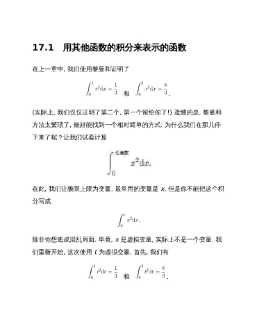 17.1 用其他函数的积分来表示的函数 在上一章中, 我们使用黎曼和证明了 和 . (实际上, 我们仅仅证明了第二个, 第一个留给你了!) 遗憾的是, 黎曼和 方法太繁琐了, 最好能找到一个相对简单的方式. 为什么我们在那儿停 下来了呢?让我们试着计算 在此, 我们让极限上限为变量. 最常用的变量是 x, 但是你不能把这个积 分写成 除非你想造成混乱局面. 毕竟, x 是虚拟变量, 实际上不是一个变量. 我 们重新开始, 这次使用 t 为虚拟变量. 首先, 我们有 和 .
