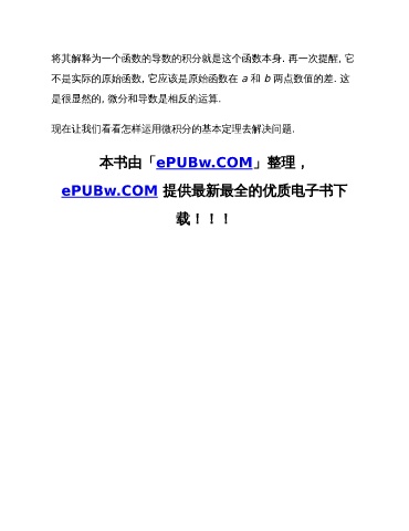 将其解释为一个函数的导数的积分就是这个函数本身. 再一次提醒, 它 不是实际的原始函数, 它应该是原始函数在 a 和 b 两点数值的差. 这 是很显然的, 微分和导数是相反的运算. 现在让我们看看怎样运用微积分的基本定理去解决问题. 本书由「ePUBw.COM」整理, ePUBw.COM 提供最新最全的优质电子书下 载!!!