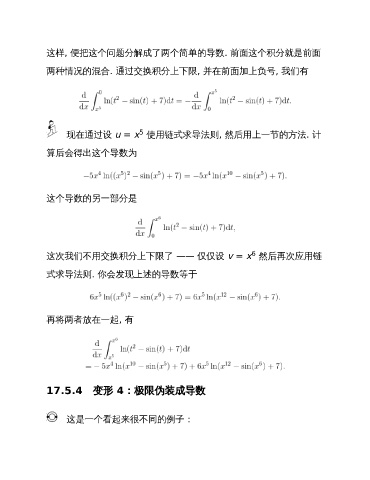 这样, 便把这个问题分解成了两个简单的导数. 前面这个积分就是前面 两种情况的混合. 通过交换积分上下限, 并在前面加上负号, 我们有 5 现在通过设 u = x 使用链式求导法则, 然后用上一节的方法. 计 算后会得出这个导数为 这个导数的另一部分是 6 这次我们不用交换积分上下限了 —— 仅仅设 v = x 然后再次应用链 式求导法则. 你会发现上述的导数等于 再将两者放在一起, 有 17.5.4 变形 4:极限伪装成导数 这是一个看起来很不同的例子: