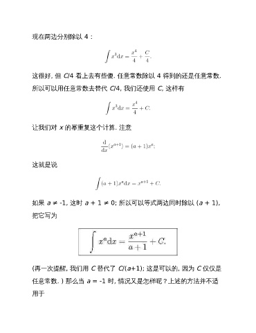 现在两边分别除以 4: 这很好, 但 C/4 看上去有些傻. 任意常数除以 4 得到的还是任意常数. 所以可以用任意常数去替代 C/4, 我们还使用 C, 这样有 让我们对 x 的幂重复这个计算. 注意 这就是说 如果 a ≠ -1, 这时 a + 1 ≠ 0; 所以可以等式两边同时除以 (a + 1), 把它写为 (再一次提醒, 我们用 C 替代了 C/(a+1); 这是可以的, 因为 C 仅仅是 任意常数. ) 那么当 a = -1 时, 情况又是怎样呢?上述的方法并不适 用于