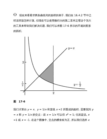 现在来看看求两条曲线间的面积的例子. 我们在 16.4.2 节中已 经说明该怎样计算, 但现在可以使用微积分的第二基本定理这个强大 的工具来帮助我们解决问题. 我们可以求图 17-6 所示的不规则图形 的面积. 图 17-6 我们计算由 y = x、y = 1/x 和直线 x =2 所围成的面积. 需要找到 y 2 = x 和 y = 1/x 的交点:设 x = 1/x 可以得 x = 1; 也就是说, x =1 或 x = -1. 在这个图像中, 交点的横坐标为正, 所以我们选择 x