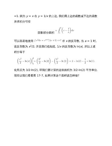 =1. 因为 y = x 在 y = 1/x 的上边, 我们用上边的函数减下边的函数 并求积分可得 阴影部分面积 可以容易地使用 求 x 的反导数, 当 a = 1 时, 2 该反导数为 x /2; 并且我们也知道, 1/x 的反导数为 ln|x|. 所以上述 积分等于 化简后为 3/2-ln(2), 即我们要计算的这块面积为 3/2-ln(2) 平方单位. 现在让我们看看图 17-7, 如果计算这个面积该怎样做?