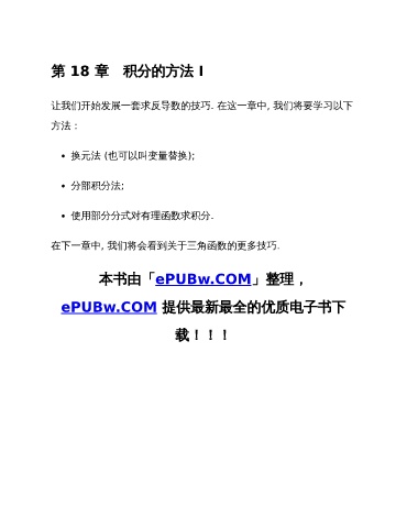 第 18 章 积分的方法 I 让我们开始发展一套求反导数的技巧. 在这一章中, 我们将要学习以下 方法: 换元法 (也可以叫变量替换); 分部积分法; 使用部分分式对有理函数求积分. 在下一章中, 我们将会看到关于三角函数的更多技巧. 本书由「ePUBw.COM」整理, ePUBw.COM 提供最新最全的优质电子书下 载!!!
