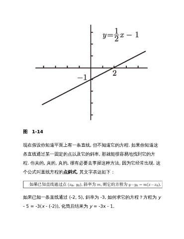 图 1-14 现在假设你知道平面上有一条直线, 但不知道它的方程. 如果你知道这 条直线通过某一固定的点以及它的斜率, 那就能很容易地找到它的方 程. 你真的, 真的, 真的, 很有必要去掌握这种方法, 因为它经常出现. 这 个公式叫直线方程的点斜式, 其文字表达如下: 如果已知一条直线通过 (-2, 5), 斜率为 -3, 如何求它的方程?方程为 y - 5 = -3(x - (-2)), 化简后结果为 y = -3x - 1.