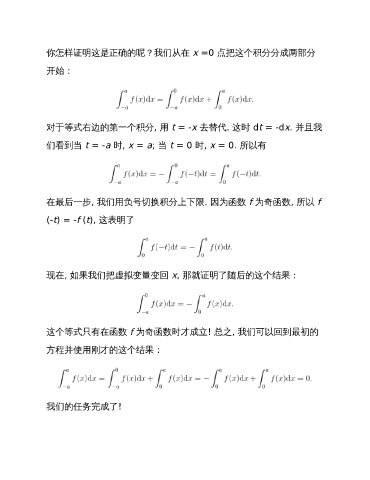 在最后一步, 我们用负号切换积分上下限. 因为函数 f 为奇函数, 所以 f