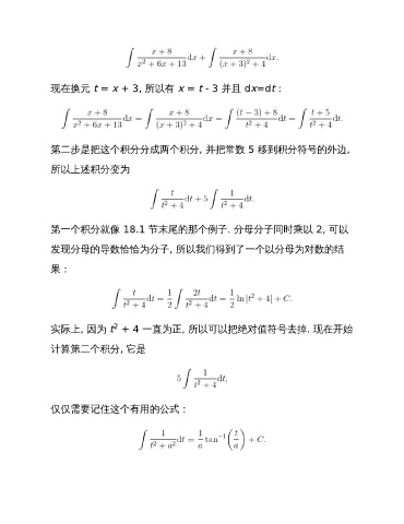 现在换元 t = x + 3, 所以有 x = t - 3 并且 dx=dt: 第二步是把这个积分分成两个积分, 并把常数 5 移到积分符号的外边, 所以上述积分变为 第一个积分就像 18.1 节末尾的那个例子. 分母分子同时乘以 2, 可以 发现分母的导数恰恰为分子, 所以我们得到了一个以分母为对数的结 果: 2 实际上, 因为 t + 4 一直为正, 所以可以把绝对值符号去掉. 现在开始 计算第二个积分, 它是 仅仅需要记住这个有用的公式: