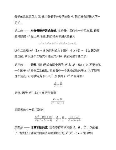第二步 —— 对分母进行因式分解. 在分母中我们有一个四次项, 很显