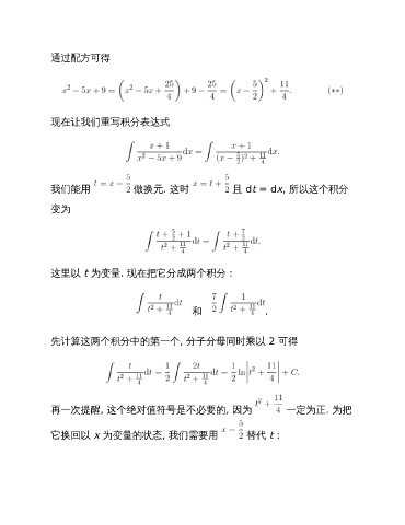 通过配方可得 现在让我们重写积分表达式 我们能用 做换元. 这时 且 dt = dx, 所以这个积分 变为 这里以 t 为变量. 现在把它分成两个积分: 和 . 先计算这两个积分中的第一个, 分子分母同时乘以 2 可得 再一次提醒, 这个绝对值符号是不必要的, 因为 一定为正. 为把 它换回以 x 为变量的状态, 我们需要用 替代 t: