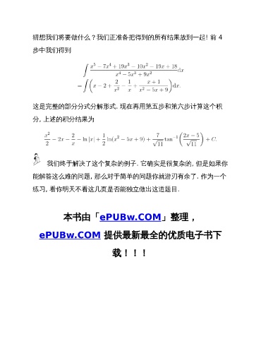 猜想我们将要做什么?我们正准备把得到的所有结果放到一起! 前 4 步中我们得到 这是完整的部分分式分解形式. 现在再用第五步和第六步计算这个积 分, 上述的积分结果为 我们终于解决了这个复杂的例子. 它确实是很复杂的, 但是如果你 能解答这么难的问题, 那么对于简单的问题你就游刃有余了. 作为一个 练习, 看你明天不看这几页是否能独立做出这道题目. 本书由「ePUBw.COM」整理, ePUBw.COM 提供最新最全的优质电子书下 载!!!