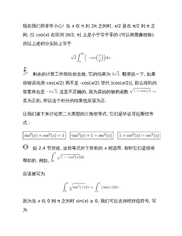 现在我们得非常小心! 当 x 在 π 到 2π 之间时, x/2 是在 π/2 到 π 之