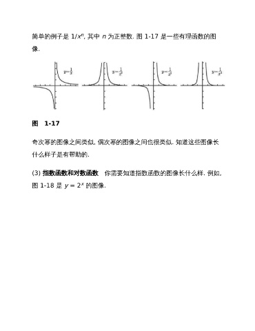 n 简单的例子是 1/x , 其中 n 为正整数. 图 1-17 是一些有理函数的图 像. 图 1-17 奇次幂的图像之间类似, 偶次幂的图像之间也很类似. 知道这些图像长 什么样子是有帮助的. (3) 指数函数和对数函数 你需要知道指数函数的图像长什么样. 例如, x 图 1-18 是 y = 2 的图像.