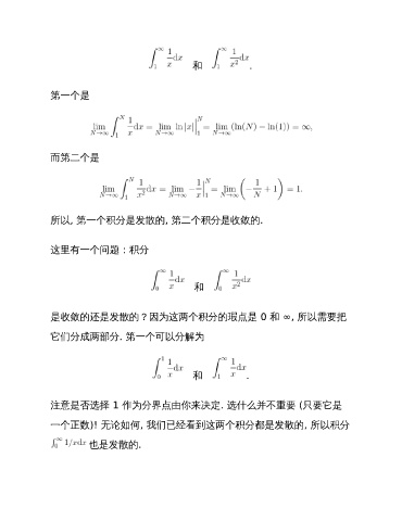 和 . 第一个是 而第二个是 所以, 第一个积分是发散的, 第二个积分是收敛的. 这里有一个问题:积分 和 是收敛的还是发散的?因为这两个积分的瑕点是 0 和 ∞, 所以需要把 它们分成两部分. 第一个可以分解为 和 . 注意是否选择 1 作为分界点由你来决定. 选什么并不重要 (只要它是 一个正数)! 无论如何, 我们已经看到这两个积分都是发散的, 所以积分 也是发散的.
