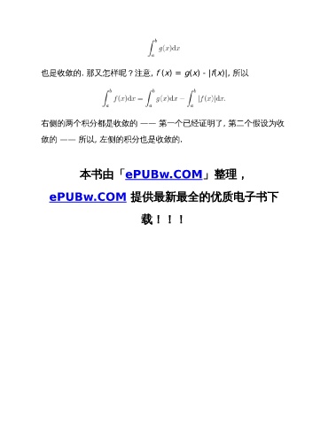 也是收敛的. 那又怎样呢?注意, f (x) = g(x) - |f(x)|, 所以 右侧的两个积分都是收敛的 —— 第一个已经证明了, 第二个假设为收 敛的 —— 所以, 左侧的积分也是收敛的. 本书由「ePUBw.COM」整理, ePUBw.COM 提供最新最全的优质电子书下 载!!!