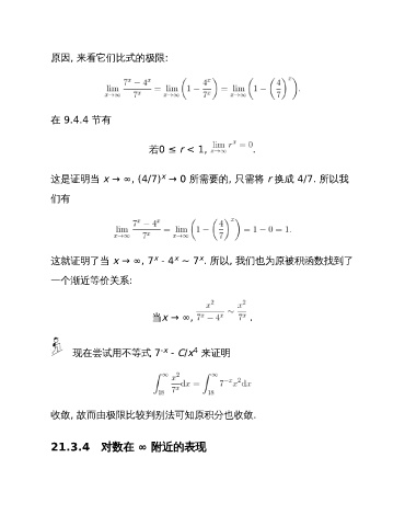 原因, 来看它们比式的极限: 在 9.4.4 节有 若0 ≤ r < 1, . x 这是证明当 x → ∞, (4/7) → 0 所需要的, 只需将 r 换成 4/7. 所以我 们有 x x x 这就证明了当 x → ∞, 7 - 4 ~ 7 . 所以, 我们也为原被积函数找到了 一个渐近等价关系: 当x → ∞, . 4 -x 现在尝试用不等式 7 - C/x 来证明 收敛, 故而由极限比较判别法可知原积分也收敛. 21.3.4 对数在 ∞ 附近的表现
