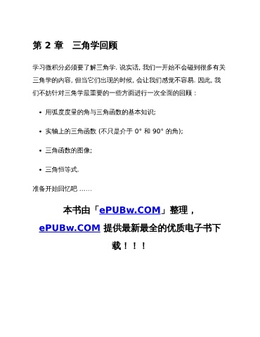 第 2 章 三角学回顾 学习微积分必须要了解三角学. 说实话, 我们一开始不会碰到很多有关 三角学的内容, 但当它们出现的时候, 会让我们感觉不容易. 因此, 我 们不妨针对三角学最重要的一些方面进行一次全面的回顾: 用弧度度量的角与三角函数的基本知识; 实轴上的三角函数 (不只是介于 0° 和 90° 的角); 三角函数的图像; 三角恒等式. 准备开始回忆吧 …… 本书由「ePUBw.COM」整理, ePUBw.COM 提供最新最全的优质电子书下 载!!!