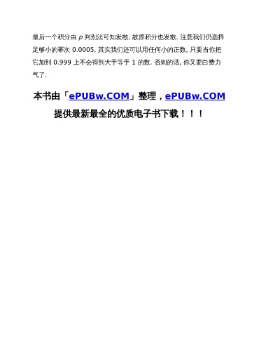 最后一个积分由 p 判别法可知发散, 故原积分也发散. 注意我们仍选择 足够小的幂次 0.0005, 其实我们还可以用任何小的正数, 只要当你把 它加到 0.999 上不会得到大于等于 1 的数. 否则的话, 你又要白费力 气了. 本书由「ePUBw.COM」整理,ePUBw.COM 提供最新最全的优质电子书下载!!!