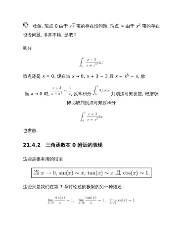 2 收敛. 瑕点 0 由于 项的存在没问题, 瑕点 ∞ 由于 x 项的存在 也没问题, 非常不错, 是吧? 积分 5 瑕点还是 x = 0, 现在当 x → 0, x + 3 ~ 3 且 x + x ~ x, 故 当 x → 0 时, , 反常积分 判别法可知发散, 根据极 限比较判别法可知原积分 也发散. 21.4.2 三角函数在 0 附近的表现 这些是很有用的结论: 这些只是我们在第 7 章讨论过的极限的另一种描述: