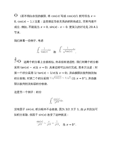 第一个积分采用 1/ tan(x) ~ 1/x(当 x → 0), 并由极限比较判别法知