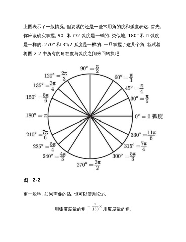 上图表示了一般情况, 但要紧的还是一些常用角的度和弧度表达. 首先, 你应该确实掌握, 90° 和 π/2 弧度是一样的. 类似地, 180° 和 π 弧度 是一样的, 270° 和 3π/2 弧度是一样的. 一旦掌握了这几个角, 就试着 将图 2-2 中所有的角在度与弧度之间来回转换吧. 图 2-2 更一般地, 如果需要的话, 也可以使用公式 用弧度度量的角 用度度量的角.
