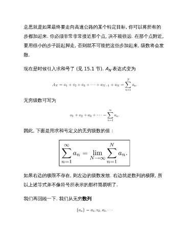 意思就是如果最终要走向高速公路的某个特定目标, 你可以将所有的 步都加起来. 你必须非常非常接近那个点, 决不能很远. 在那个点附近, 要用很小的步子踮起脚走, 否则就不可能把这些步加起来, 级数将会发 散. 现在是时候引入求和号了 (见 15.1 节). A 表达式变为 N 无穷级数可写为 因此, 下面是用求和号定义的无穷级数的值: 如果右边的极限不存在, 则左边的级数发散. 右边就是数列的极限, 所 以上述等式并不像符号所表示的那样简易明了. 我们再回顾一下. 我们从无穷数列