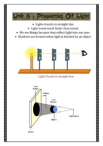 • Lights travels in straight line • Light travel much faster than sound • We see things because they reflect light into our eyes • Shadows are formed when light is blocked by an object