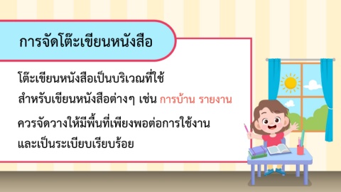 การจัดโต๊ะเขียนหนังสือ โต๊ะเขียนหนังสือเป็นบริเวณที่ใช้ ส าหรับเขียนหนังสือต่างๆ เช่น การบ้าน รายงาน ควรจัดวางให้มีพื้นที่เพียงพอต่อการใช้งาน และเป็นระเบียบเรียบร้อย