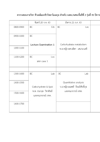 ตำรำงสอนรำยวิชำ ชีวเคมีและชีววิทยำโมเลกุล ส ำหรับ นพท./นศพ.ชั้นปีที่ 2 รุ่นที่ 45 ปีกำรศึกษำ 2563 ภำคกำรศึกษำที่ 1 (ระหว่ำงวันที่ 20 ก.ค.– 24 ก.ค. 63) (สัปดำห์ที่ 6)