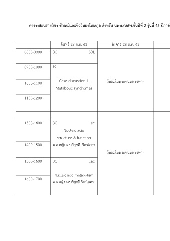 ตำรำงสอนรำยวิชำ ชีวเคมีและชีววิทยำโมเลกุล ส ำหรับ นพท./นศพ.ชั้นปีที่ 2 รุ่นที่ 45 ปีกำรศึกษำ 2563 ภำคกำรศึกษำที่ 1 (ระหว่ำงวันที่ 27 ก.ค.– 31 ก.ค. 63) (สัปดำห์ที่ 7)