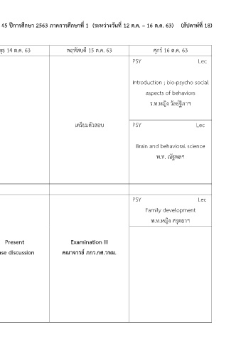 ตำรำงสอนรำยวิชำ ประสำทวิทยำศำสตร์กำรแพทย 2/จิตวิทยำ ส ำหรับ นพท./นศพ.ชั้นปีที่ 2 รนที่ 45 ปีกำรศึกษำ 2563 ภำคกำรศึกษำที่ 1 (ระหว่ำงวันที่ 12 ต.ค. – 16 ต.ค. 63) (สัปดำห์ที่ 18)