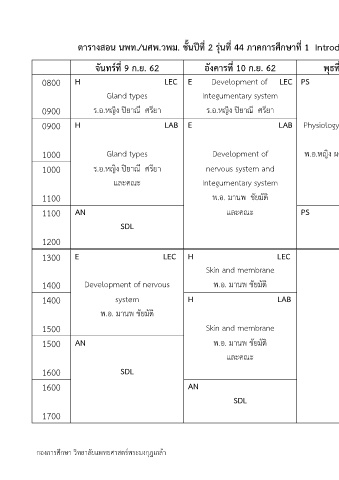ตารางสอน นพท./นศพ.วพม. ชั้นปีท 2 รุ่นที่ 44 ภาคการศึกษาที่ 1 Introduction to Medical Science ระหว่างวันที่ 9 – 13 ก.ย. 62 (สัปดาห์ที่ 4)