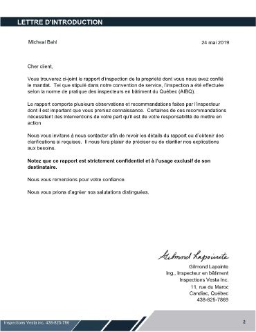 le mandat. Tel que stipulé dans notre convention de service, l’inspection a été effectuée