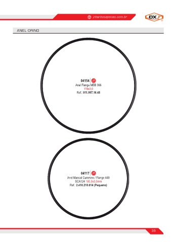 jrbarbosapecas.com.br ANEL ORING 04154 Anel Flange MBB 366 119x3,0 Ref.: 011.997.16.48 04117 Anel Mancal Cummins / Flange 449 SCA124 100,0x3,0mm Ref.: 2.410.210.014 (Pequeno) 39