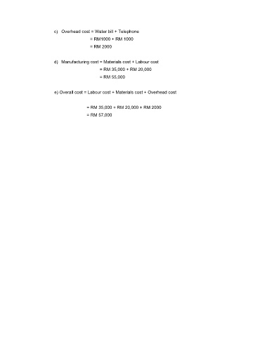 e) Overall cost = Labour cost + Materials cost + Overhead cost