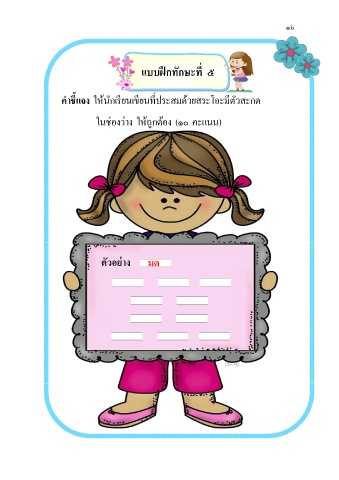 ๑๖ แบบฝกทักษะที่ ๕ ึ ี ี ี่ ี ค ำชแจง ให้นักเรยนเขยนทประสมด้วยสระโอะมตัวสะกด ้ ี ในช่องว่าง ให้ถูกต้อง (๑๐ คะแนน) ่ ตัวอยำง มด