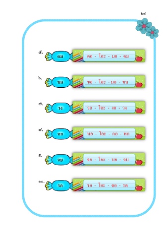 ๒๙ ๕. ดม ดอ - โอะ - มอ - ดม ๖. ขน ขอ - โอะ - นอ - ขน ๗. วง วอ - โอะ - งอ - วง ๘. หก หอ - โอะ - กอ - หก ๙. จบ จอ - โอะ - บอ - จบ ๑๐. รด รอ - โอะ - ดอ - รด