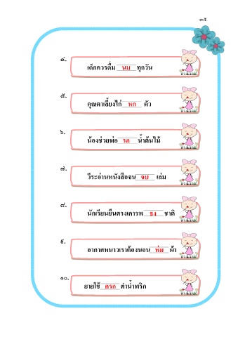 ๓๕ ๔. ื่ เด็กควรดม นม ทุกวัน ๕. ่ คุณตำเลี้ยงไก หก ตัว ๖. ้ ้ ่ ่ ้ นองชวยพอ รด น้ำตนไม ๗. ื ่ ั ่ วีระอำนหนงสอจน จบ เลม ๘. ี ื ั นกเรยนยนตรงเคำรพ ธง ชำติ ๙. ้ ่ ้ อำกำศหนำวเรำตองนอน หม ผำ ๑๐. ยำยใช ครก ต ำน้ำพรก ้ ิ