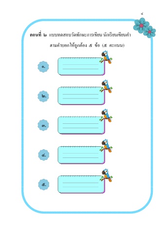 ๔ ี ี ี ตอนที่ ๒ แบบทดสอบวัดทักษะการเขยน นักเรยนเขยนค า ตามค าบอกให้ถูกต้อง ๕ ข้อ (๕ คะแนน) ๑. ๒. ๓. ๔. ๕.