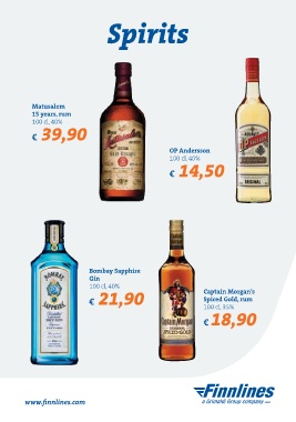 Spirits Matusalem 15 years, rum 100 cl, 40% € 39,90 OP Andersson 100 cl, 40% € 14,50 Bombay Sapphire Gin 100 cl, 40% Captain Morgan’s € 21,90 Spiced Gold, rum 100 cl, 35% €18,90 www.finnlines.com