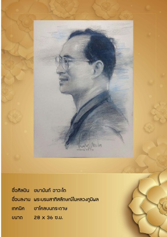ชื่อศิลปิน ชยานันท์ อาวะโต ชื่อผลงาน พระบรมสาทิสลักษณ์ในหลวงภูมิพล เทคนิค ชาโคลบนกระดาษ ขนาด 28 x 36 ซ.ม.
