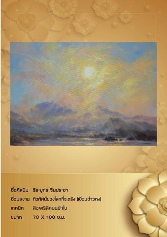 ชื่อศิลปิน ธีระยุทธ จีนประชา ชื่อผลงาน ทิวทัศน์ของโลกที่จ.ตรัง (เขื่อนอ่าวตง) เทคนิค สีอะคริลิคบนผ้าใบ ขนาด 70 X 100 ซ.ม.