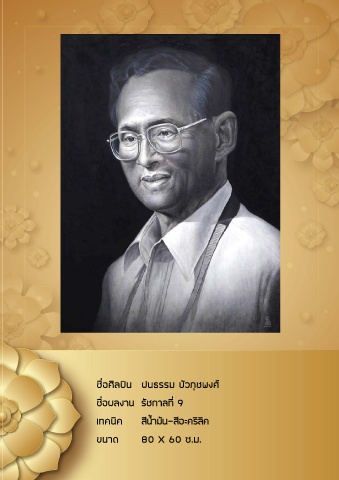 ชื่อศิลปิน ฝนธรรม บัวภุชพงศ์ ชื่อผลงาน รัชกาลที่ 9 เทคนิค สีน้ำ มัน-สีอะคริลิค ขนาด 80 X 60 ซ.ม.