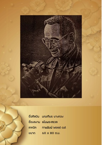 ชื่อศิลปิน มณเฑียร ยางทอง ชื่อผลงาน แย้มพระสรวล เทคนิค ภาพพิมพ์ Wood cut ขนาด 60 x 80 ซ.ม.