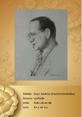 ชื่อศิลปิน วัฒนา จันทร์ชาย (ภาพวาดจากคนติดเตียง) ชื่อผลงาน มองด้วยรัก เทคนิค ดินสอ 2B และ EE ขนาด 54 x 42 ซ.ม.