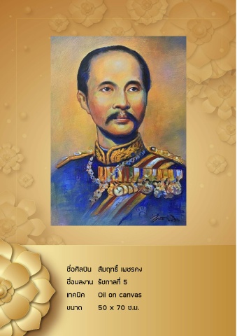 ชื่อศิลปิน สัมฤทธิ์ เพชรคง ชื่อผลงาน รัชกาลที่ 5 เทคนิค Oil on canvas ขนาด 50 x 70 ซ.ม.