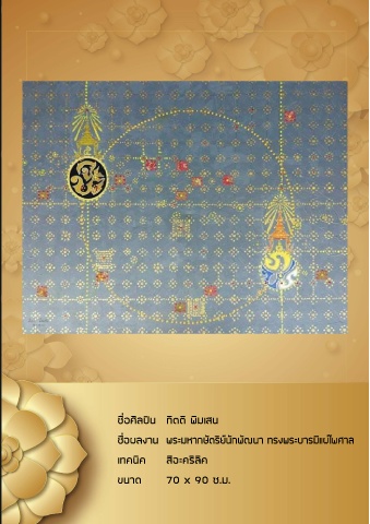 ชื่อศิลปิน กิตติ พิมเสน ชื่อผลงาน พระมหากษัตริย์นักพัฒนา ทรงพระบารมีแผ่ไพศาล เทคนิค สีอะคริลิค ขนาด 70 x 90 ซ.ม.