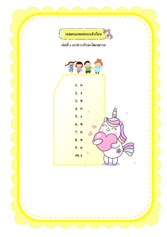 เฉลยแบบทดสอบหลังเรยน ี ่ เลมที่ 6 กำรธ ำรงรกษำวัฒนธรรม ั 1. ค 2. ง 3. ข 4. ค 5. ง 6. ข 7. ก 8. ข 9. ก 10.ง