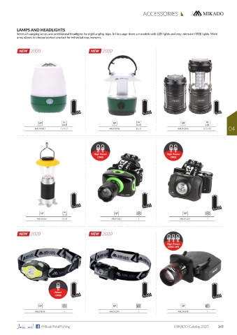 Series of camping lamps and professional headlights for night angling trips. In the range there are models with LED lights and very intensive CREE lights. Wide